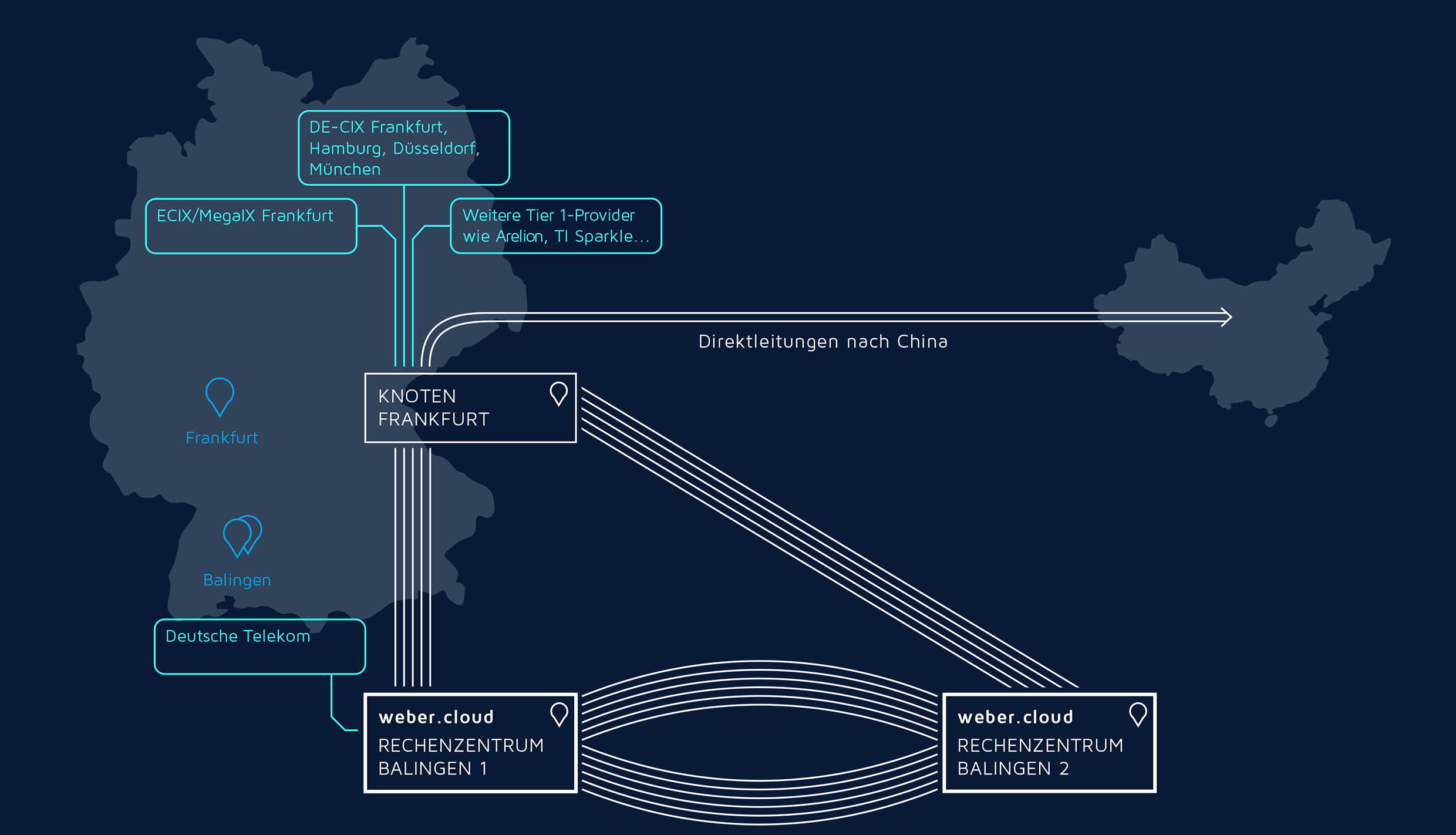 Der weber.cloud Backbone ist mit dem Fokus auf die größtmögliche Unabhängigkeit von Drittfirmen konzipiert, wodurch gleichzeitig eine minimale Latenz bei maximalem Durchsatz sichergestellt wird. Die weber.cloud ist über mehrere, räumlich vollständig getrennt verlaufende Glasfasertrassen redundant mit der Außenwelt verbunden.